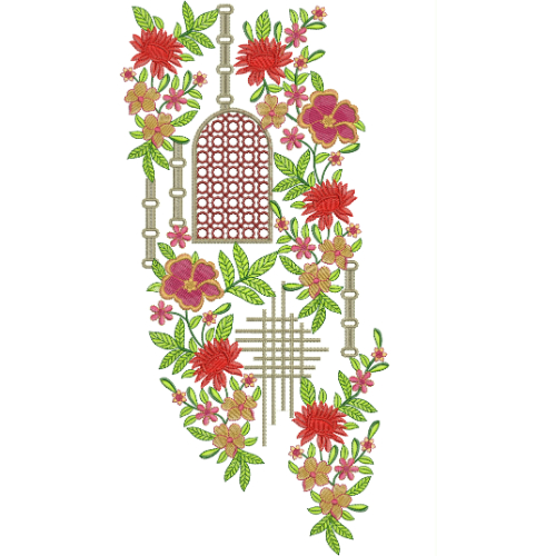 This elegant neckline embroidery design features a beautiful fusion of architectural arch motifs and vibrant floral vine arrangements, creating a refined and artistic neckline composition. The design is structured with a decorative arched panel at the center, enhanced by intricate geometric lattice patterns that add depth and a sophisticated designer touch. These structured elements provide a balanced base that complements the flowing floral details.