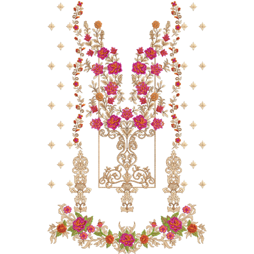 The harmonious combination of lush floral bouquet arrangements, delicate vine motifs, intricate ornamental scrollwork, scattered decorative accents, and a refined floral border makes this embroidery design ideal for luxury dress fronts, festive outfits, formal ethnic wear, designer garments, and elegant embroidered clothing where floral beauty and ornamental craftsmanship are desired.