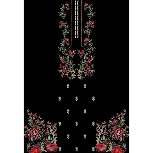The black background provides strong contrast, allowing the floral detailing to stand out vividly. This front panel design is ideal for use on kurtis, long shirts, frocks, anarkali dresses, shawls, and formal ethnic garments. It is also suitable for digital textile printing, embroidery reference designs, and surface pattern projects. The overall design reflects elegance, simplicity, and traditional beauty, making it a versatile choice for premium textile and fashion collections.