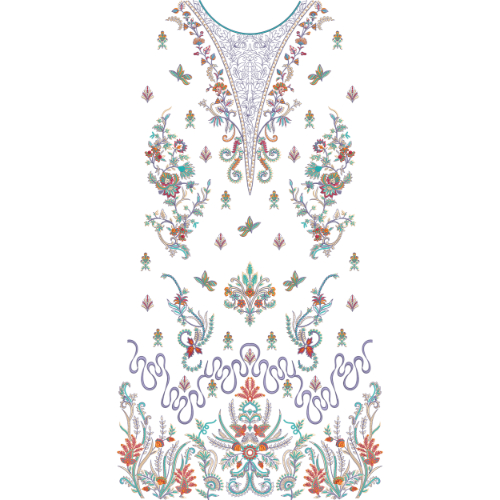 The light background enhances the softness and clarity of the pastel colors, making the design ideal for elegant and refined fashion applications. This front panel design is suitable for use on kurtis, long shirts, frocks, anarkali dresses, formal wear, festive outfits, and luxury pret collections. It is also suitable for digital textile printing, embroidery reference designs, surface pattern projects, and premium decorative fabric applications.