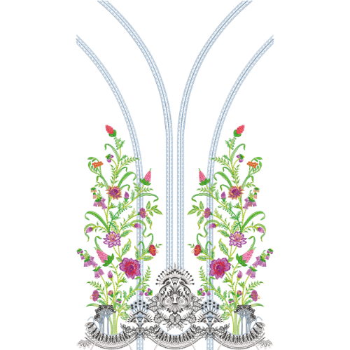 A graceful embroidery-style textile design featuring a symmetrical floral neckline composition with soft pastel flowers and curved decorative lines, ideal for refined ethnic garment prints.