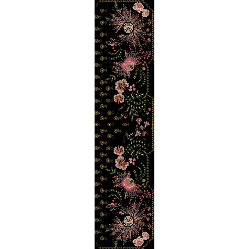 A refined embroidery-style vertical border textile print featuring detailed floral motifs in soft pink and gold tones with decorative dotted accents on a black background.