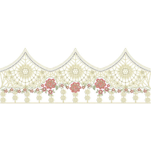 The combination of scalloped arches, radial floral medallions, fine lace-style lattice stitching, and delicate hanging floral details creates a sophisticated lace embroidery border. The refined structure and intricate botanical ornamentation make this design suitable for decorative garment embellishments where elegant lace-inspired embroidery patterns are desired.