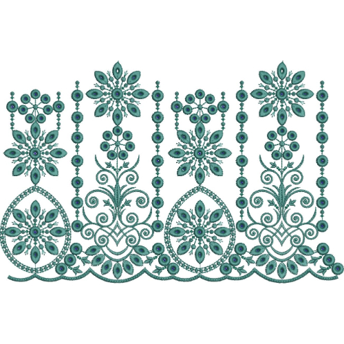 The lower edge of the embroidery is completed with a scalloped lace border formed by gently curved arches. Along this border, small leaf-shaped elements and bead-like stitches are arranged in a repeating sequence, creating a refined decorative finish that enhances the lace character of the design.