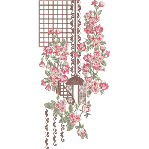 This elegant floral lattice neckline embroidery design features a stylish and artistic composition crafted for women’s modern and traditional fashion garments. The design showcases a structured vertical neckline panel enhanced with a geometric lattice background, ornamental borders, and beautifully arranged blooming floral branches. The graceful combination of soft floral embroidery with decorative architectural elements creates a refined and luxurious look ideal for kurtis, kameez, tunics, and designer dresses.