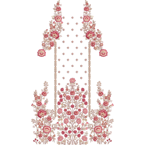 The harmonious combination of symmetrical floral vines, scattered decorative motifs, structured vertical borders, and a richly detailed botanical base makes this embroidery design ideal for luxury dress fronts, festive garments, designer ethnic wear, formal outfits, and elegant embroidered clothing where floral beauty and intricate craftsmanship create a timeless decorative style.