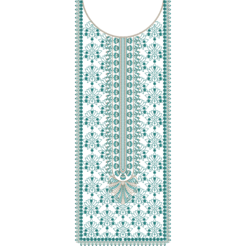 This neckline embroidery design features a beautifully structured elongated panel enriched with intricate floral patterns and refined ornamental detailing. The neckline is softly rounded and framed with a beaded-style border that adds a delicate and decorative edge, enhancing the overall elegance of the design.