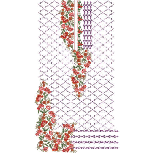 The harmonious combination of flowing floral vines, geometric lattice detailing, vertical neckline ornamentation, and decorative border elements makes this embroidery design ideal for stylish dress fronts, contemporary ethnic wear, festive outfits, designer lawn suits, and elegant embroidered garments where modern structure meets classic floral artistry.