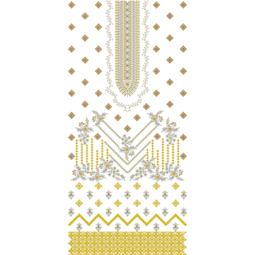 The lower section is enhanced with detailed border patterns and ornamental geometric designs, completing the composition with a polished and luxurious finish. Ideal for dresses, kurtis, festive wear, and formal outfits, this embroidery pattern offers a perfect blend of modern geometric styling and classic decorative artistry, making it suitable for elegant and high-end garment creations.