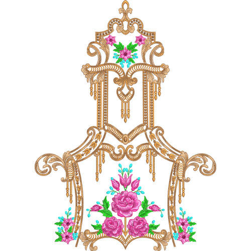 This design showcases an elegant baroque-inspired embroidery motif composed of rich golden ornamental scrolls and arches. The structure resembles a regal frame with symmetrical curves, hanging bead-like details, and finely stitched decorative elements that enhance its royal appearance. At the center and base of the design, lush floral arrangements in shades of deep pink and rose are highlighted with fresh teal leaves and buds, adding a vivid contrast to the warm gold tones.