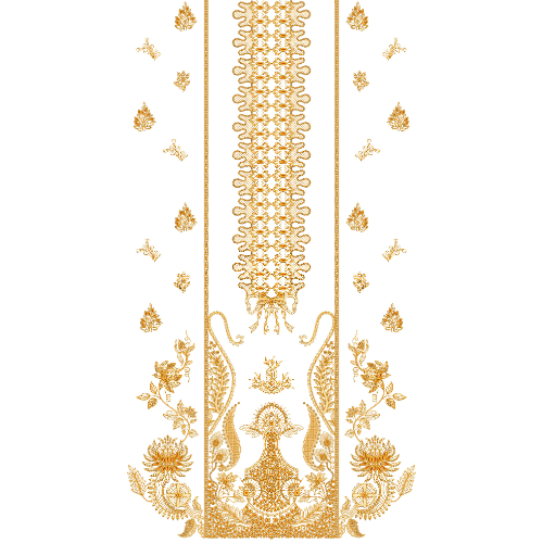 This embroidery dress design features a luxurious and vertically structured composition centered around a long, intricately detailed neckline panel. The central panel is filled with dense ornamental patterns, including fine linear detailing and repetitive motifs that create a rich and textured focal point, enhancing the overall elegance of the garment.