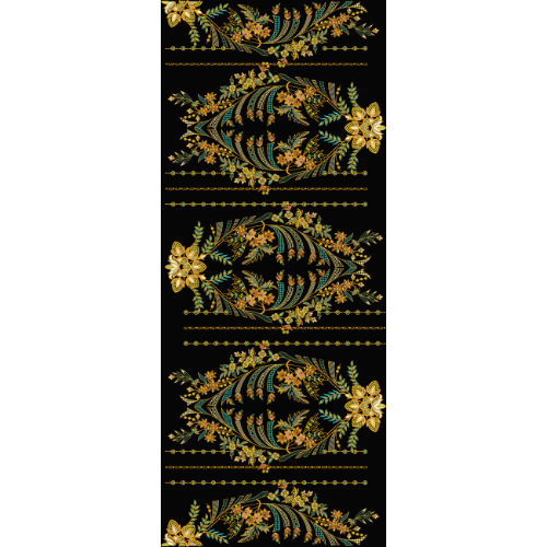 Elegant Golden Floral Paisley Embroidery Style Vertical Textile Print on Black Base