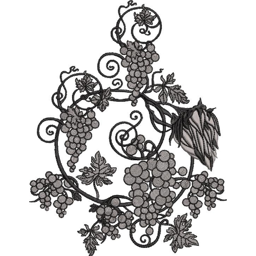 This refined embroidery design features a beautifully arranged grapevine composition enhanced with intricate ornamental scrollwork. The design is structured around flowing circular vines that create a balanced and decorative framework, giving the composition a graceful and artistic appearance.
