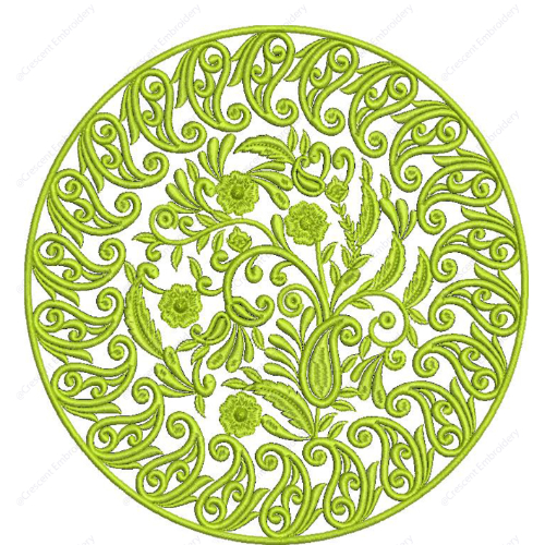 Elegant Green Circular Floral Cushion Embroidery Design with Decorative Scroll Border
