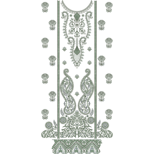 This sophisticated dress embroidery design features a beautifully structured vertical composition enriched with intricate paisley and floral ornamental elements. The upper section showcases a refined neckline panel adorned with delicate scrollwork, fine linear detailing, and symmetrical decorative motifs that create a graceful and elegant focal point.