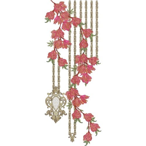 Ideal for formal dresses, luxury kurtis, bridal wear, and festive outfits, this hanging floral neckline embroidery design offers a sophisticated and premium look. The harmonious blend of vibrant pink floral tones, green foliage, and antique ornamental accents makes it suitable for fabrics such as chiffon, silk, organza, velvet, and lawn. This neckline embroidery pattern provides a timeless and fashionable statement, making it an excellent choice for high-end embroidered garments and designer collections.