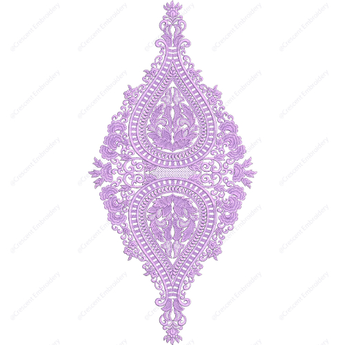 This refined embroidery design features a beautifully symmetrical composition built around two elongated paisley motifs arranged along a vertical axis. Each paisley element is intricately detailed with fine inner patterns, including delicate floral shapes, curved lines, and layered textures that create depth and visual richness.