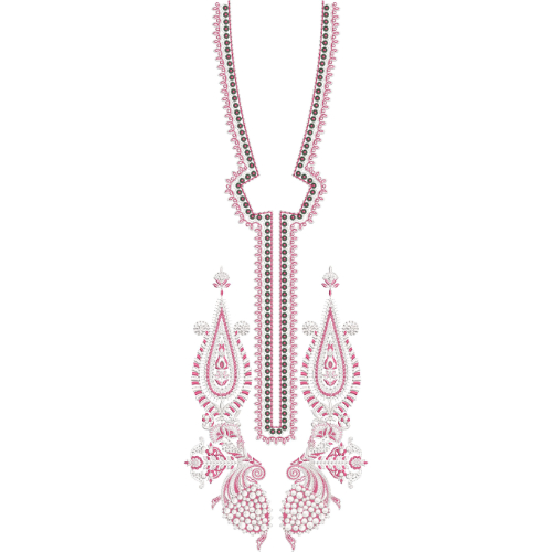 This elegant long neckline embroidery design features a refined keyhole-style composition enhanced with delicate paisley and ornamental motifs. The design is structured in a slim elongated layout that begins with a narrow neckline opening and extends downward with fine symmetrical detailing. Soft pink embroidery combined with subtle contrasting accents creates a graceful and sophisticated appearance.