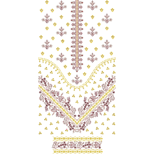 This sophisticated embroidery design features a graceful combination of maroon and gold floral motifs arranged in a structured V-panel layout. The upper section showcases a finely detailed vertical neckline panel enhanced with delicate ornamental patterns and small scattered floral accents that create a balanced and refined focal point. Evenly spaced decorative motifs add texture and visual harmony across the composition.