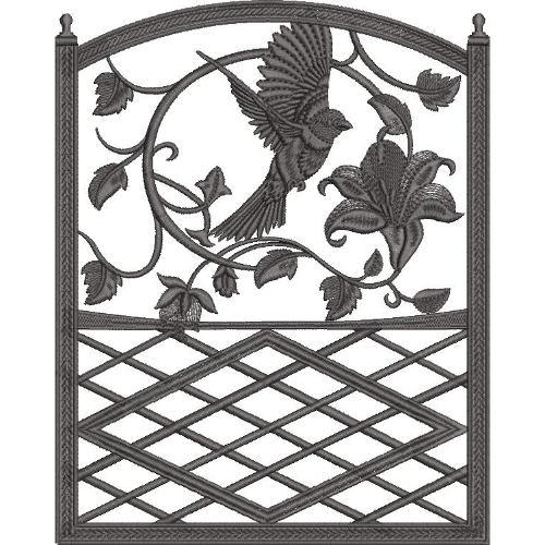 Elegant Monochrome Embroidery Design with Bird Motif and Decorative Garden Trellis
