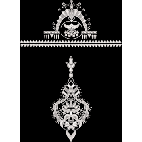 A refined monochrome embroidery design featuring a decorative Mughal-inspired top border and a central hanging ornamental motif in classic white-on-black contrast.