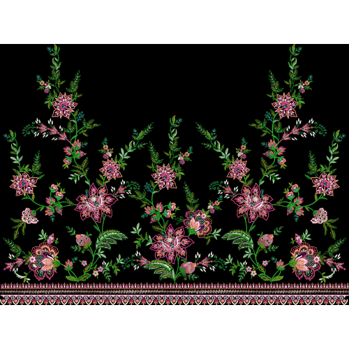 A richly detailed floral embroidered-style border design featuring vibrant pink and green blossoms on a black background, ideal for luxury textile borders and elegant fashion fabrics.