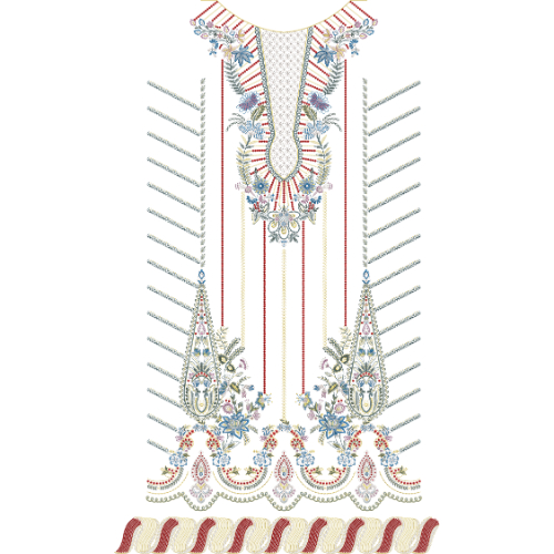 A refined embroidery-style textile print featuring a decorative neckline with multicolor floral motifs, vertical linear detailing, and ornamental borders arranged in a complete garment panel layout.