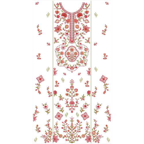 The lower section features lush botanical patterns and finely arranged floral elements that complete the composition with depth and sophistication. Ideal for dresses, kurtis, festive wear, bridal outfits, and formal garments, this embroidery pattern blends traditional floral artistry with modern elegance, making it perfect for high-end fashion creations and designer garment collections.