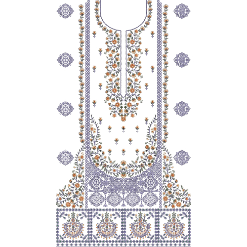 The lower section is completed with a richly detailed ornamental panel and a decorative border featuring layered patterns and classic motifs that provide a polished and luxurious finish. Ideal for dresses, kurtis, festive wear, bridal outfits, and formal garments, this embroidery pattern blends traditional floral artistry with modern elegance, making it perfect for high-end fashion creations and designer garment collections.