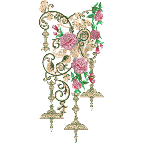 Elegant Paisley Floral Neckline Embroidery Design with Ornamental Scrolls and Hanging Tassel Elements