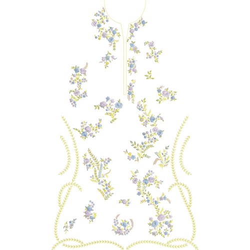 The lower portion is completed with gently curved vine-style borders and delicate floral accents that provide a cohesive and polished finish. Perfect for front panels of dresses, kurtis, and spring or summer wear, this embroidery design blends timeless floral artistry with soft pastel elegance, making it ideal for premium machine embroidery and designer fashion collections.