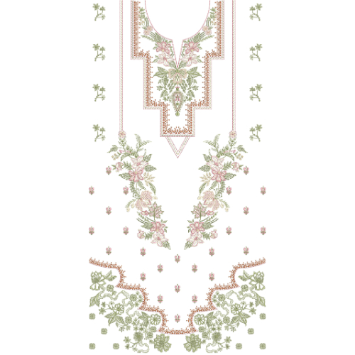 This embroidery dress design showcases a soft and sophisticated composition centered around a rounded neckline that transitions into a uniquely structured ornamental panel. The neckline is finely detailed with layered geometric borders and delicate floral accents, creating a refined focal point that enhances the elegance of the garment.