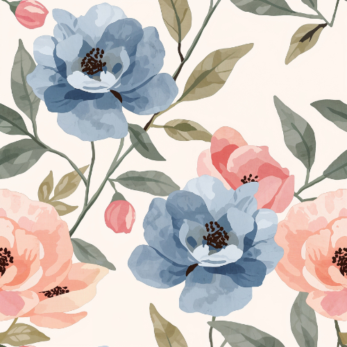 The color palette blends soft peach blossoms, dusty blue flowers, and natural green botanical foliage, producing a timeless floral aesthetic that feels both elegant and vintage-inspired. The watercolor-style illustration and romantic botanical composition make the pattern suitable for classic, cottage-style, and feminine design collections.