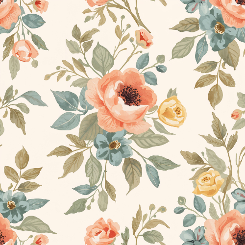 The harmonious color palette of peach, warm coral, soft yellow, dusty teal, and muted green botanical tones creates a timeless floral style that feels both elegant and versatile. The combination of classic roses and botanical foliage makes this pattern suitable for romantic, vintage, cottage-style, and botanical themed design collections.