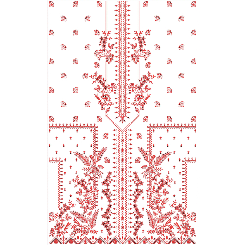 The hemline is completed with a detailed ornamental border featuring repeating geometric and floral patterns, providing a polished and cohesive finish. The use of vibrant red tones creates a striking and elegant aesthetic, making this embroidery design ideal for festive wear, formal attire, and premium ethnic fashion collections.