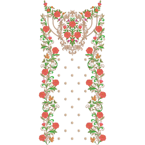 The harmonious combination of ornamental neckline embroidery, symmetrical rose floral vines, scattered decorative motifs, and intricate scrollwork makes this embroidery design ideal for luxury dress fronts, festive garments, designer ethnic wear, formal outfits, and elegant embroidered clothing where floral beauty and detailed craftsmanship create a timeless decorative style.