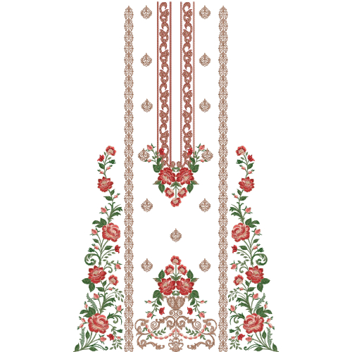 The harmonious combination of ornamental vertical panels, blooming rose floral vines, scattered decorative motifs, and a refined ornamental base makes this embroidery design ideal for luxury dress fronts, festive garments, traditional ethnic wear, designer outfits, and elegant embroidered clothing where classic floral beauty and ornamental craftsmanship create a timeless decorative style.