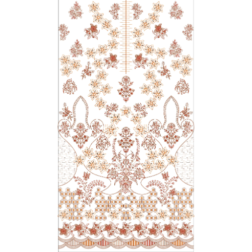 This elegant traditional embroidery design showcases a beautifully detailed arrangement of ornamental floral motifs combined with classic decorative elements, creating a refined and luxurious dress pattern. The design features symmetrical floral arrangements, delicate botanical forms, and intricate ornamental detailing that bring a graceful and timeless aesthetic to fashion garments.
