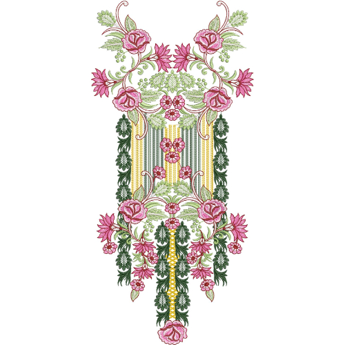 This elegant vintage floral panel neckline embroidery design showcases a harmonious blend of classic botanical artistry and ornamental symmetry, making it a perfect centerpiece for luxury ethnic and contemporary garments. The design features a refined vertical panel composition enriched with delicately arranged roses, leafy vines, and ornamental floral clusters that create a graceful and sophisticated visual appeal.
