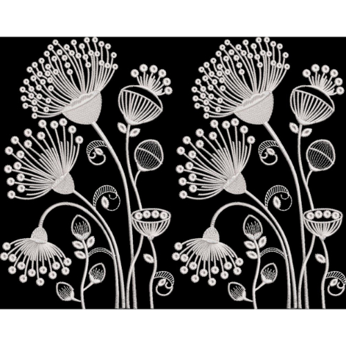 This textile border design showcases a contemporary botanical composition created in elegant white embroidery-style detailing against a deep black background. The design features tall, stylized floral stems with artistic blossoms and decorative buds arranged in a graceful and rhythmic pattern.