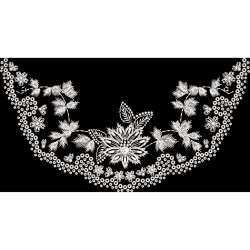 This textile design features a delicate white floral embroidery-style neckline border arranged in a graceful U-shaped composition on a deep black background. Ideal for sophisticated ethnic and formal garment designs.