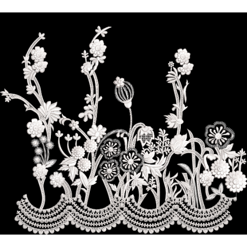 The composition features a variety of floral stems rising upward from a scalloped ornamental base. Each stem is adorned with delicately illustrated flowers, buds, and leaves, rendered in fine white embroidery-style line work. The flowers vary in size and shape, adding natural rhythm and visual interest to the design. The intricate detailing closely resembles traditional hand embroidery and lacework techniques.
