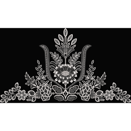 This textile design showcases a beautifully balanced ornamental composition inspired by traditional white-on-black embroidery. The background is a solid deep black, which creates a strong contrast and highlights the fine white detailing of the floral elements. The design is horizontally arranged, making it suitable for borders, decorative panels, or statement garment accents.