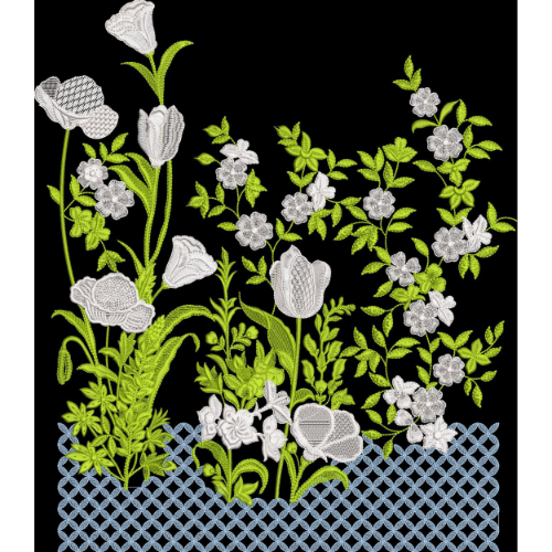 At the lower portion of the design, a light blue geometric lattice border adds structure and contrast, balancing the free-flowing floral arrangement above. The deep black background enhances the brightness and clarity of the white and green elements, making the design visually striking. This textile print is ideal for fashion fabrics, embroidered-style garments, dupattas, scarves, shawls, home décor textiles, and decorative panels. The refined detailing and seamless layout make it suitable for high-quality digital textile printing and premium fabric applications.