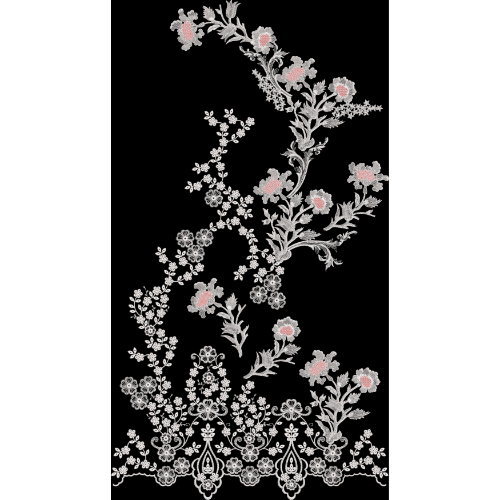This textile design showcases a beautifully detailed vertical floral lace panel created in elegant white embroidery-style detailing with soft pink floral accents set against a deep black background. The composition reflects a refined blend of delicate blossoms, flowing vines, and ornamental lace elements arranged in a graceful upward movement.
