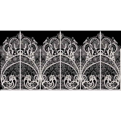 This embroidery border design showcases a highly detailed lace-inspired ornamental pattern rendered in elegant white threadwork on a deep black background. The design is composed of repeating arched panels, each filled with delicate scrolls, floral curls, and fine filigree-style detailing that enhances its rich and sophisticated appearance.