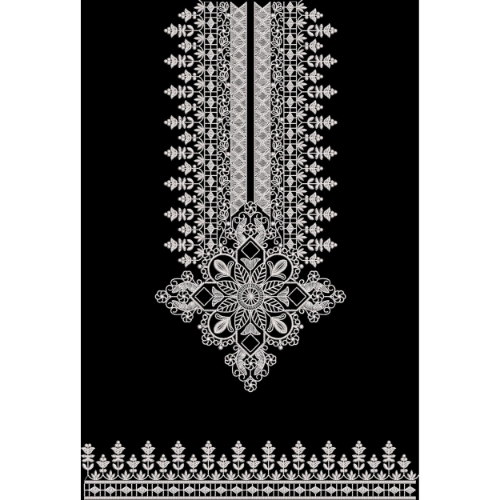 The deep black background enhances contrast and highlights every intricate detail, adding depth and luxury to the design. This front panel design is ideal for use on kurtis, long shirts, straight suits, formal ethnic wear, festive outfits, and minimalist bridal garments. It is also suitable for digital textile printing, embroidery reference designs, cutwork inspiration, and premium surface pattern projects. The overall aesthetic reflects symmetry, refinement, and timeless elegance, making it a strong choice for high-end textile collections.