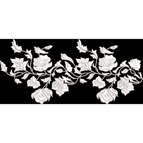 This textile border design showcases a refined and elegant arrangement of blooming rose flowers and flowing vines rendered in soft white tones against a deep black background. The strong contrast highlights the intricate embroidery-style detailing, giving the design a classic and luxurious appearance.