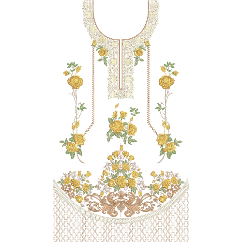 The harmonious combination of yellow rose floral arrangements, ornamental neckline embroidery, vertical botanical vines, and a richly detailed floral border makes this embroidery design ideal for luxury dress fronts, festive garments, designer ethnic wear, formal outfits, and elegant embroidered clothing where delicate floral beauty and ornamental craftsmanship create a timeless decorative style.