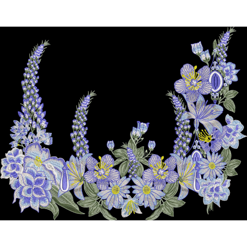 This illustration showcases a beautifully composed embroidered necklace-style floral motif arranged in a smooth, curved layout. The design features layered blossoms in soft shades of blue and lavender, highlighted with delicate yellow centers and fine stitch detailing. Slender floral spikes and leafy branches rise gently from the main floral cluster, adding height, elegance, and natural movement to the composition.